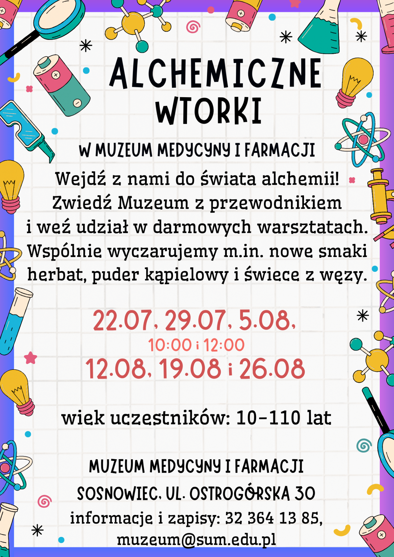 Od 22 lipca do 26 sierpnia w każdy wtorek zapraszamy wszystkich w wieku 10-110 lat na darmowe warsztaty, podczas których odkryjemy m.in. nowe smaki herbat, puder kąpielowy czy świece z węzy pszczelej. Zajęcia są przeznaczone zarówno dla osób indywidualnych, jak i grup zorganizowanych. Warunkiem wzięcia udziału jest zakupienie biletu wstępu do Muzeum i zwiedzenie ekspozycji wraz z przewodnikiem. Wejście na zwiedzanie i warsztaty odbywa się zgodnie z harmonogramem: