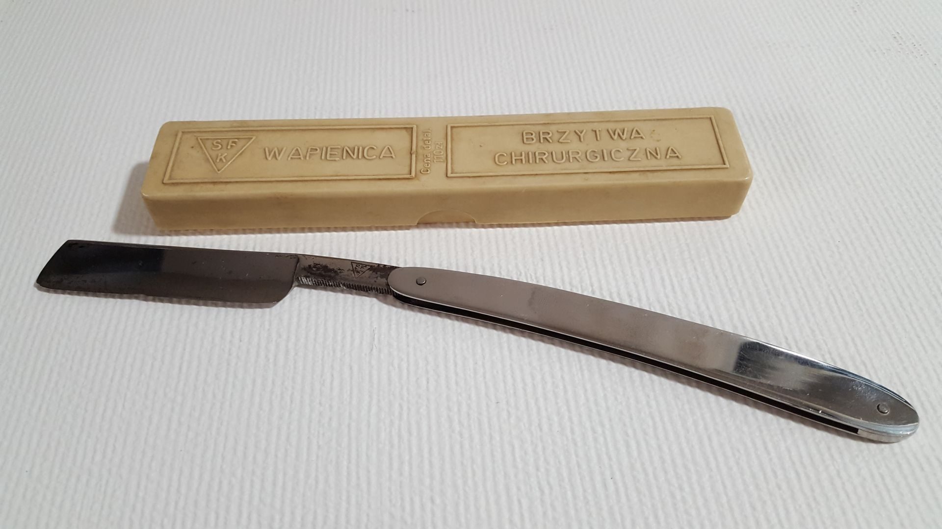 Brzytwa chirurgiczna firmy SFK Wapienica. Starobielska Fabryka Kos powstała w 1938 roku. Produkowała między innymi brzytwy stosowane do golenia pacjentów przed zabiegami. Brzytwy chirurgiczne były zrobione z dobrej stali i sterylizowano je po użyciu.